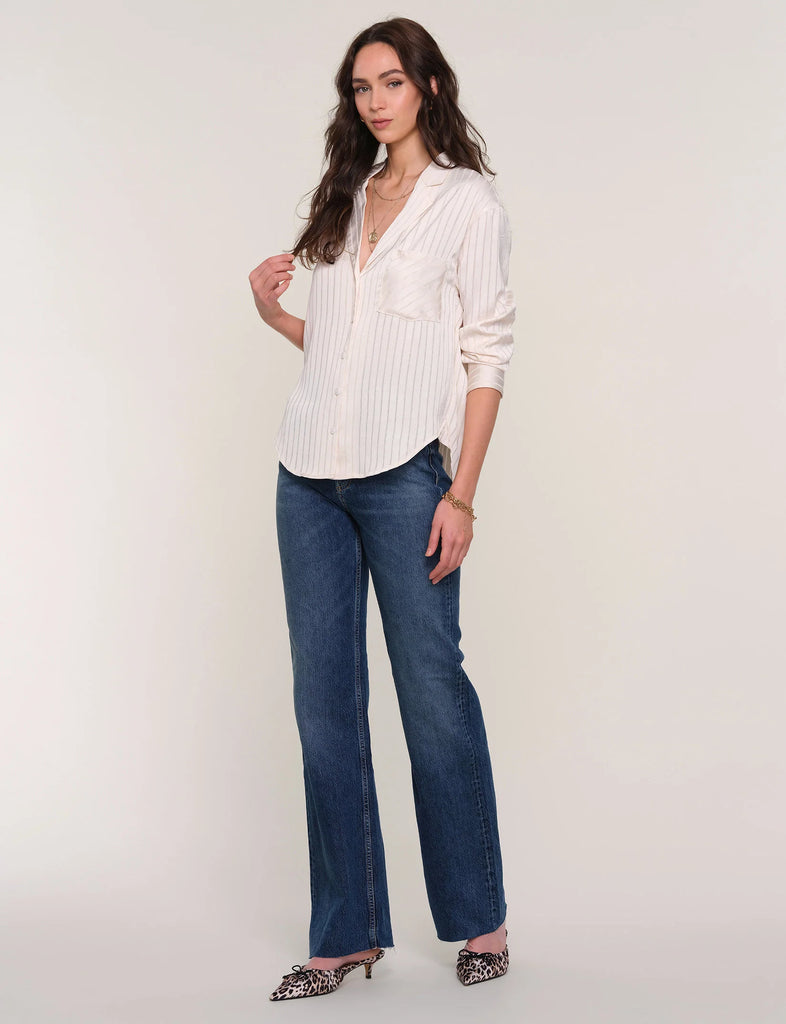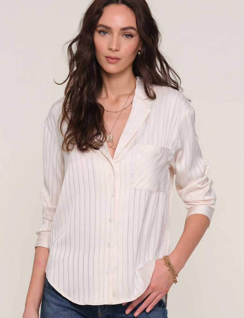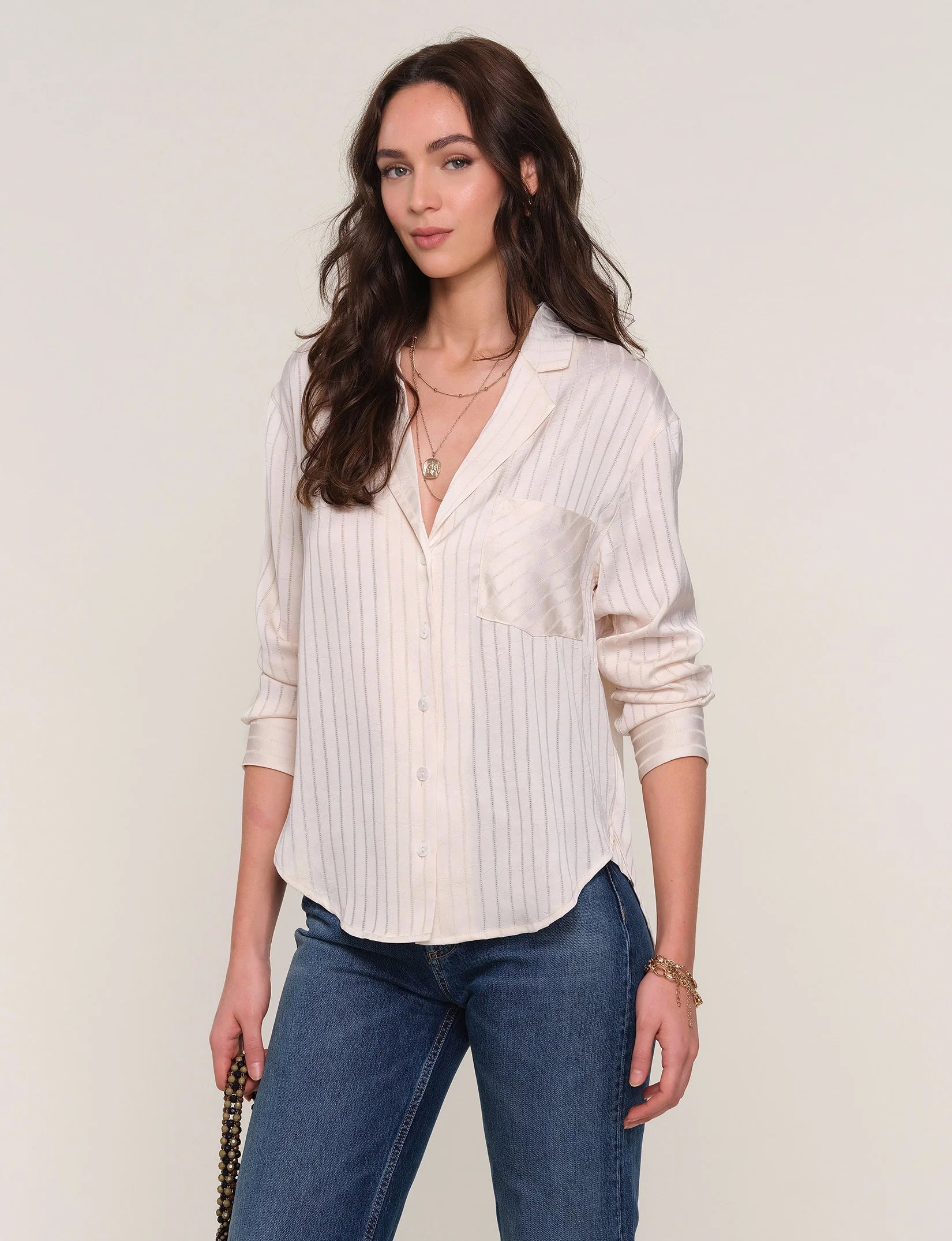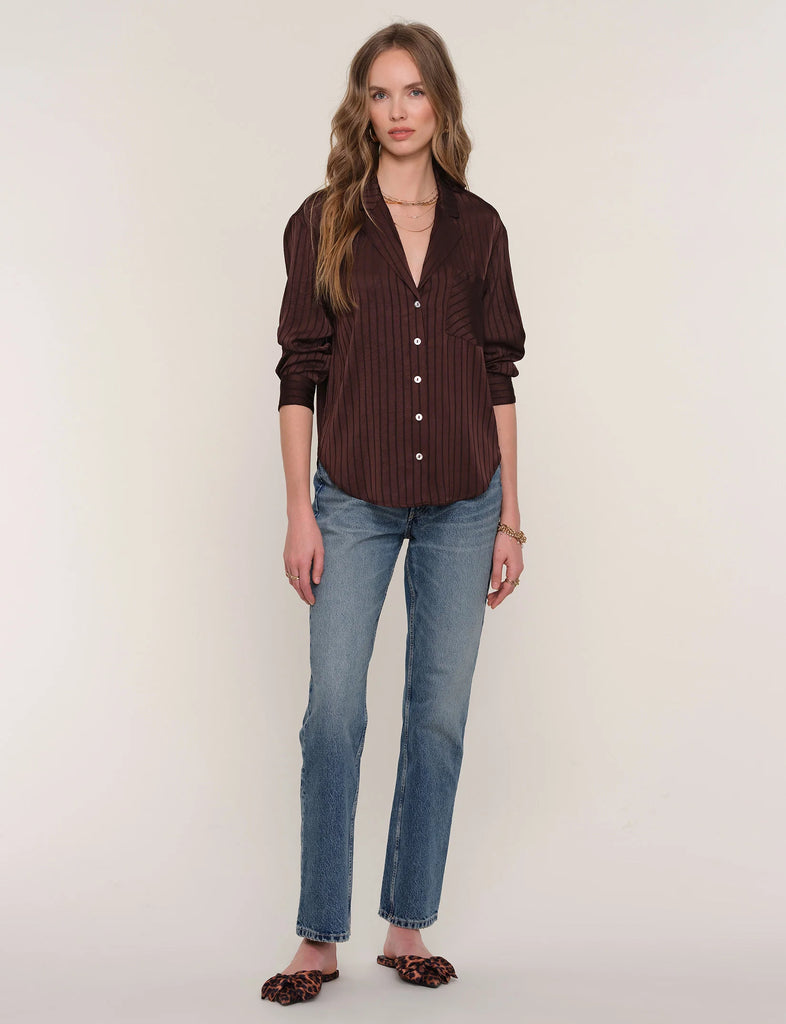 The Eren Shirt is a simple, v-neck button down shirt, with a collar and a relaxed fit. It's made from a luxe, striped satin. Dress it up, or dress it down.