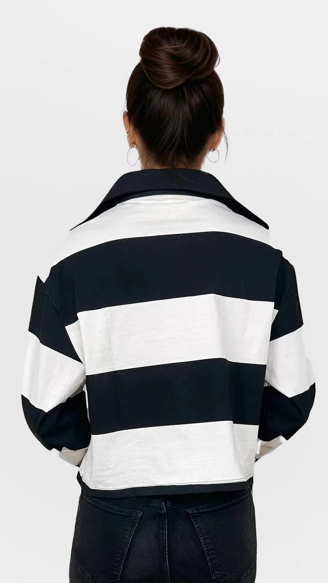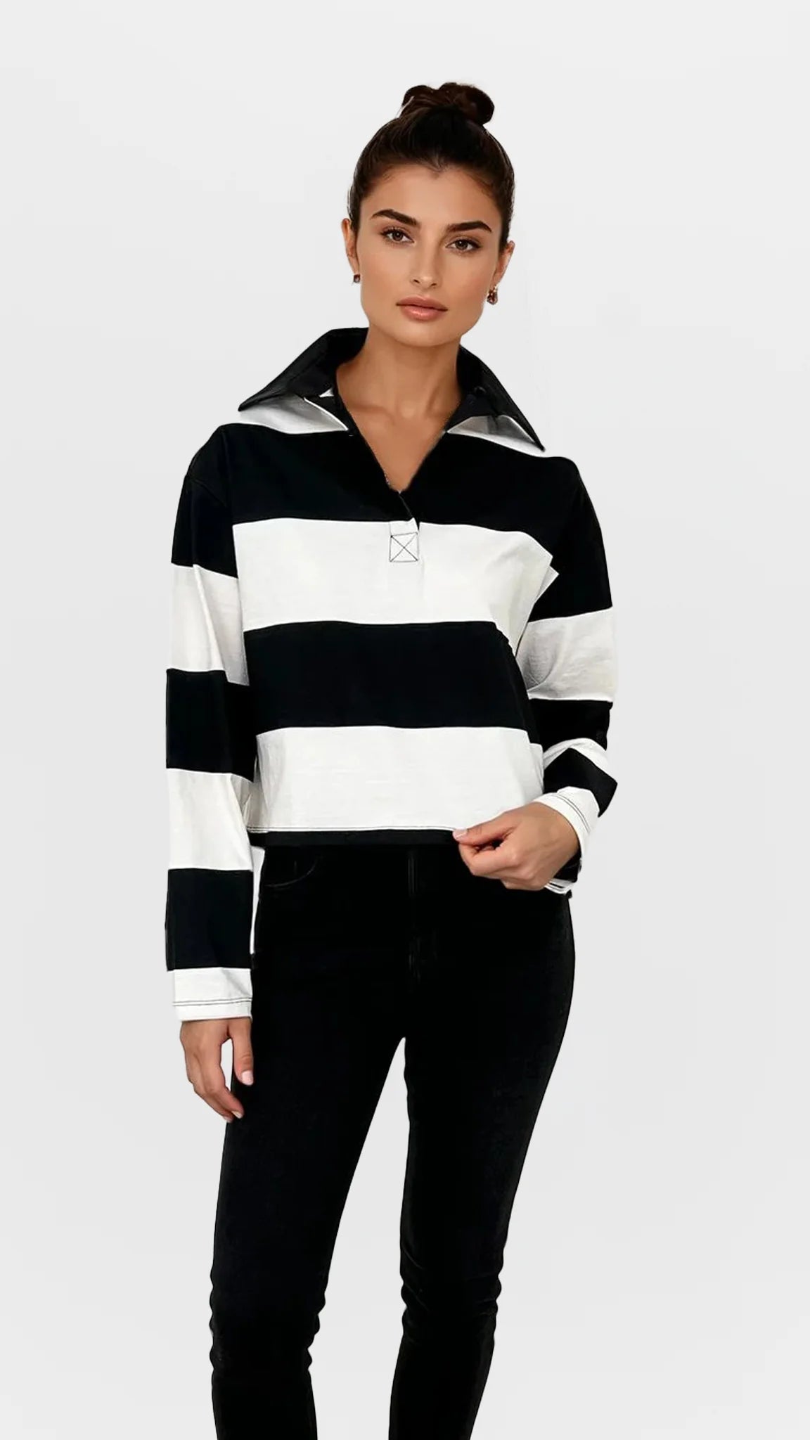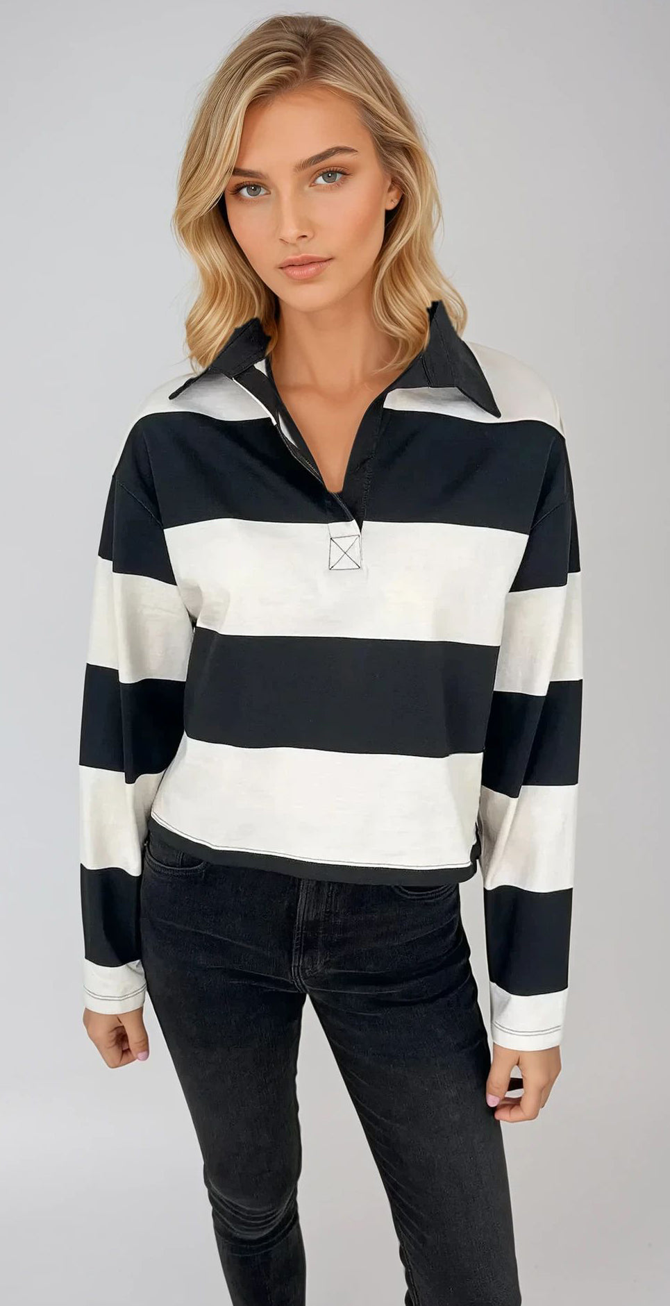 The Maryse Rugby Shirt gives the classic pitch staple a modern, off-duty twist. Cut in breathable 100% cotton with bold, wide stripes, it features a crisp rugby collar and a relaxed, slightly cropped silhouette that layers effortlessly over everything from denim to skirts.