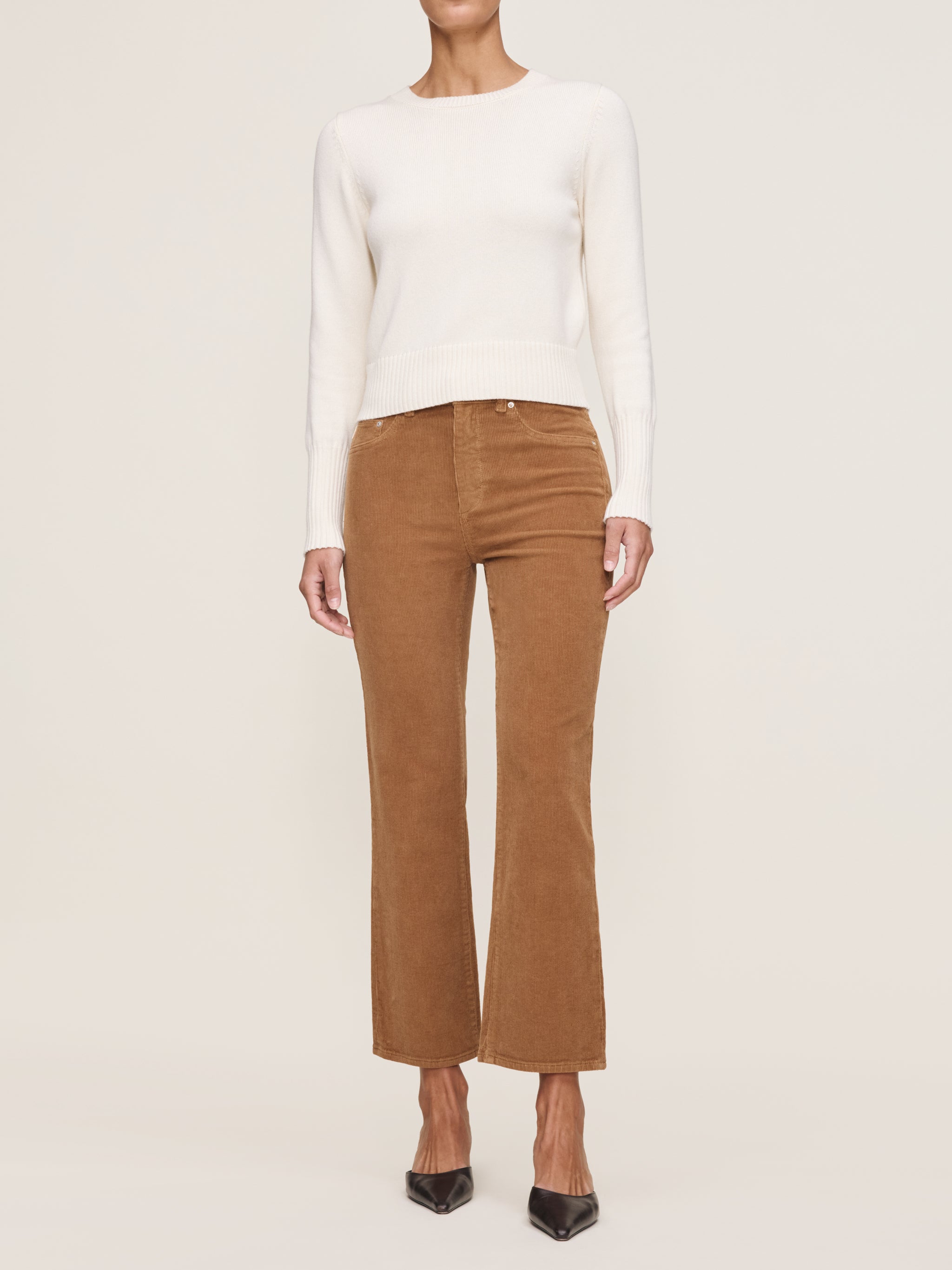 Bridget is a high-rise, cropped boot cut fit that utilizes our Instasculpt™ technology to smooth, sculpt, and conform to your body for the perfect fit. Teakwood is a golden brown corduroy with yellow undertones. It features gold hardware, tonal stitching, a clean hem and an ecru back patch.
