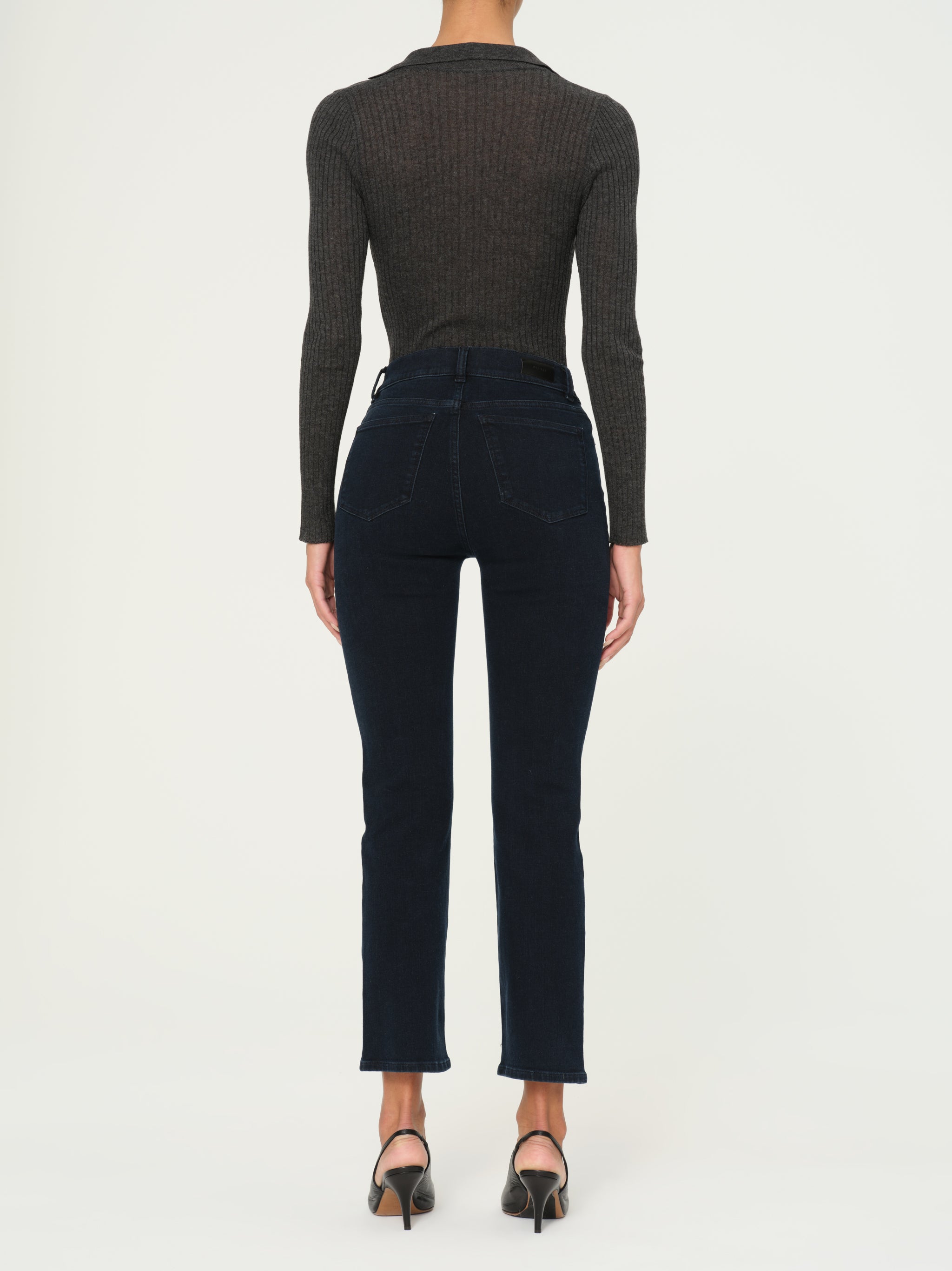 Mara is a mid-rise, ankle length straight leg fit that utilizes our Instasculpt™ technology to smooth, sculpt, and conform to your body for the perfect fit. Flatiron is a deep indigo wash. It features shiny silver hardware, tonal stitching, clean hem and a black back patch.