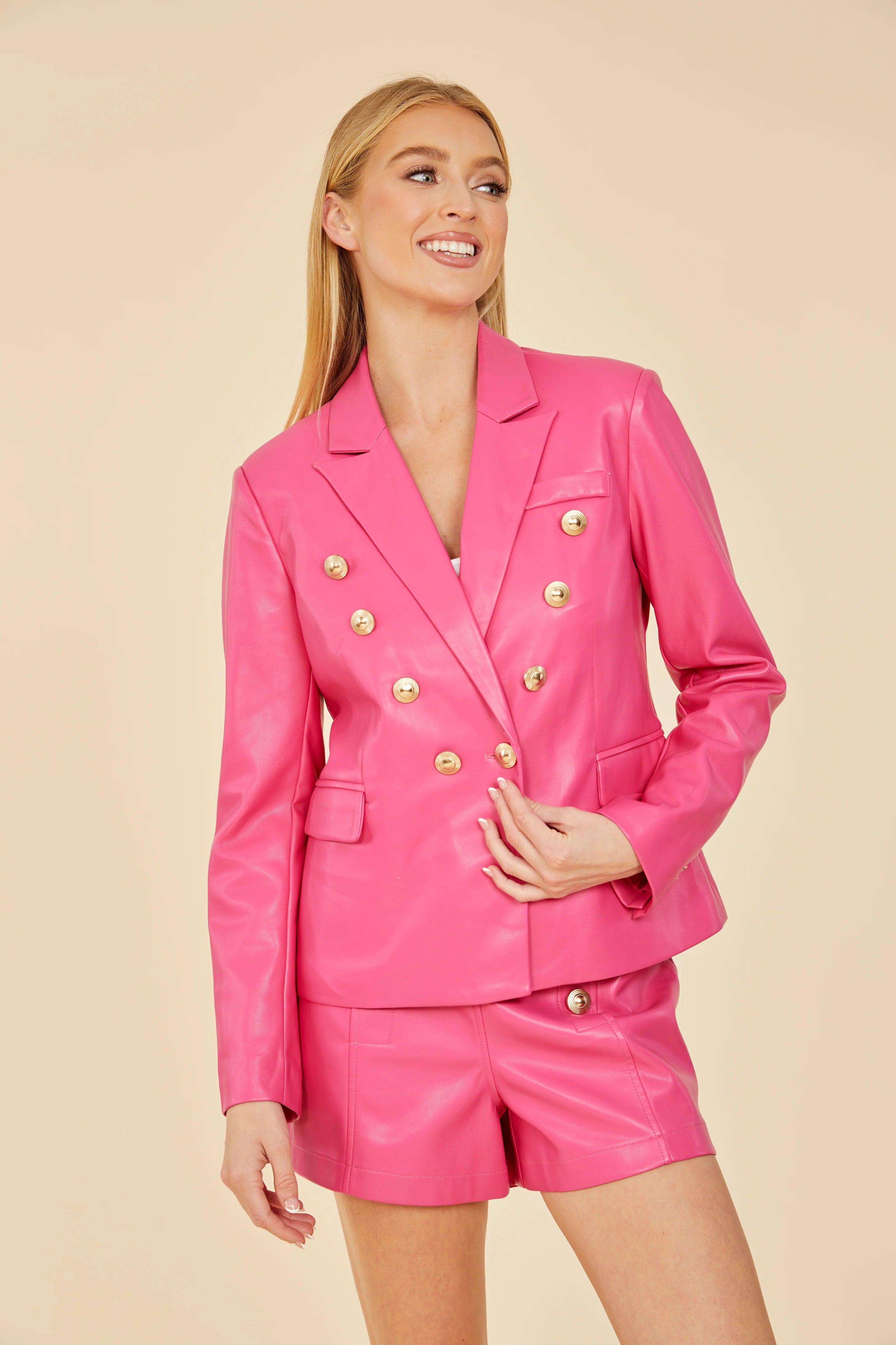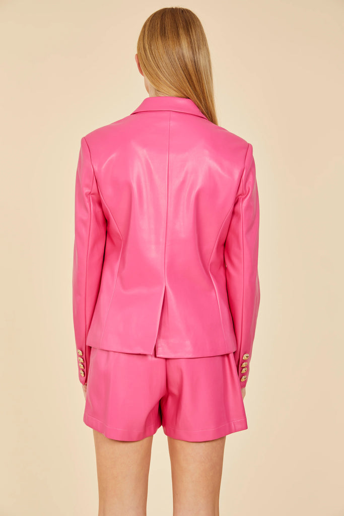 Unleash your inner fashion icon with our Double-Breasted Faux Leather Blazer. This chic piece comes in a vibrant hot pink hue that will work well with the rest of your colorful wardrobe. The double-breasted style, adorned with metallic gold buttons along the front and on the cuffs, exudes sophistication. Embrace a bold and stylish look with this statement piece, adding a pop of color and flair to your wardrobe for the warmer seasons.