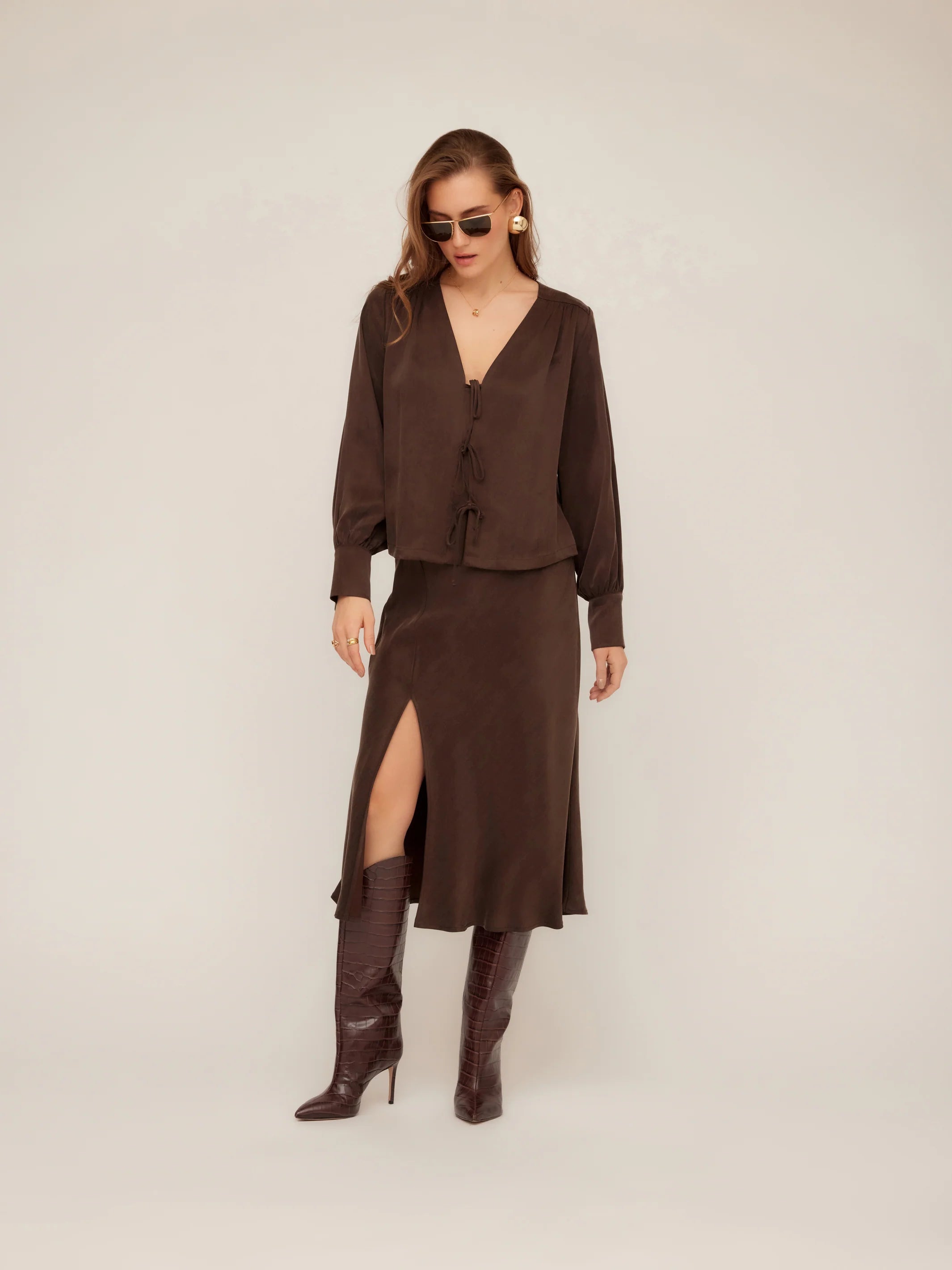 Crafted from fluid cupro woven fabric, this long-sleeve top features a plunging V-neckline with three adjustable front ties that create soft, feminine bow details. Gentle gathers at the front shoulders and center-back pleats add subtle dimension, while a relaxed fit and gathered button cuffs finish the look with ease and polish.