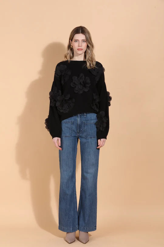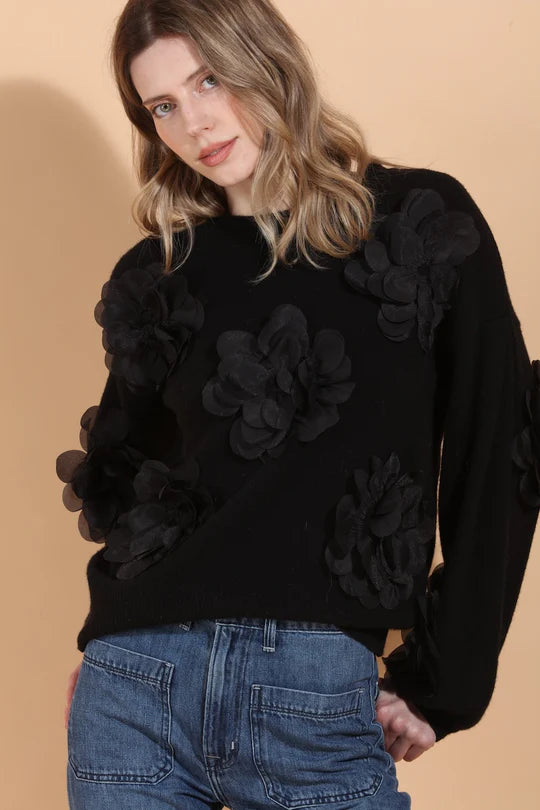 Merino Wool Round Neck Sweater with 3-D Floral Appliqué