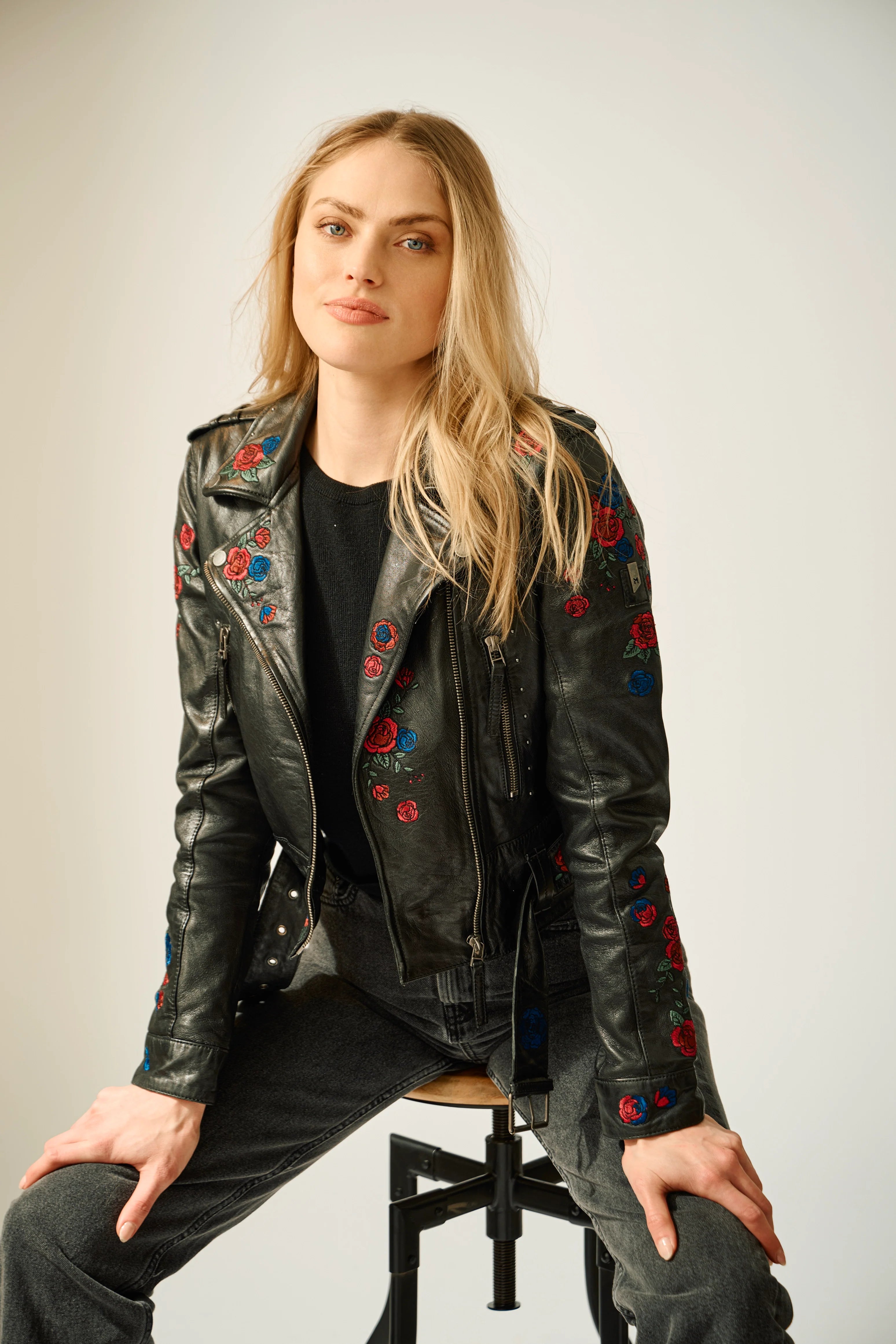 The Isabella Leather Jacket blends classic moto styling with intricate craftsmanship. Embroidered rose motifs are thoughtfully placed across the jacket, adding a refined, artistic touch to its sleek leather design while maintaining a perfect balance of edge and elegance.