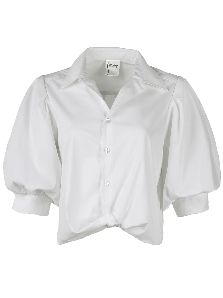 Finley "Bomba" white silky poplin shirt features a front twist at the hem