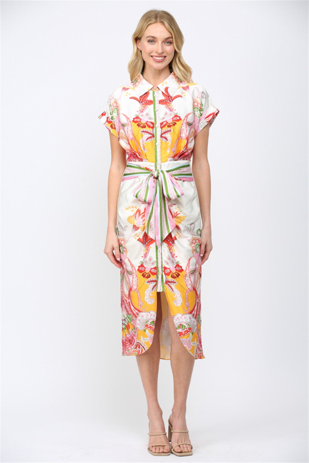 BOTANIC SCARF PRINT SELF TIE WAIST BUTTON DOWN DRESS