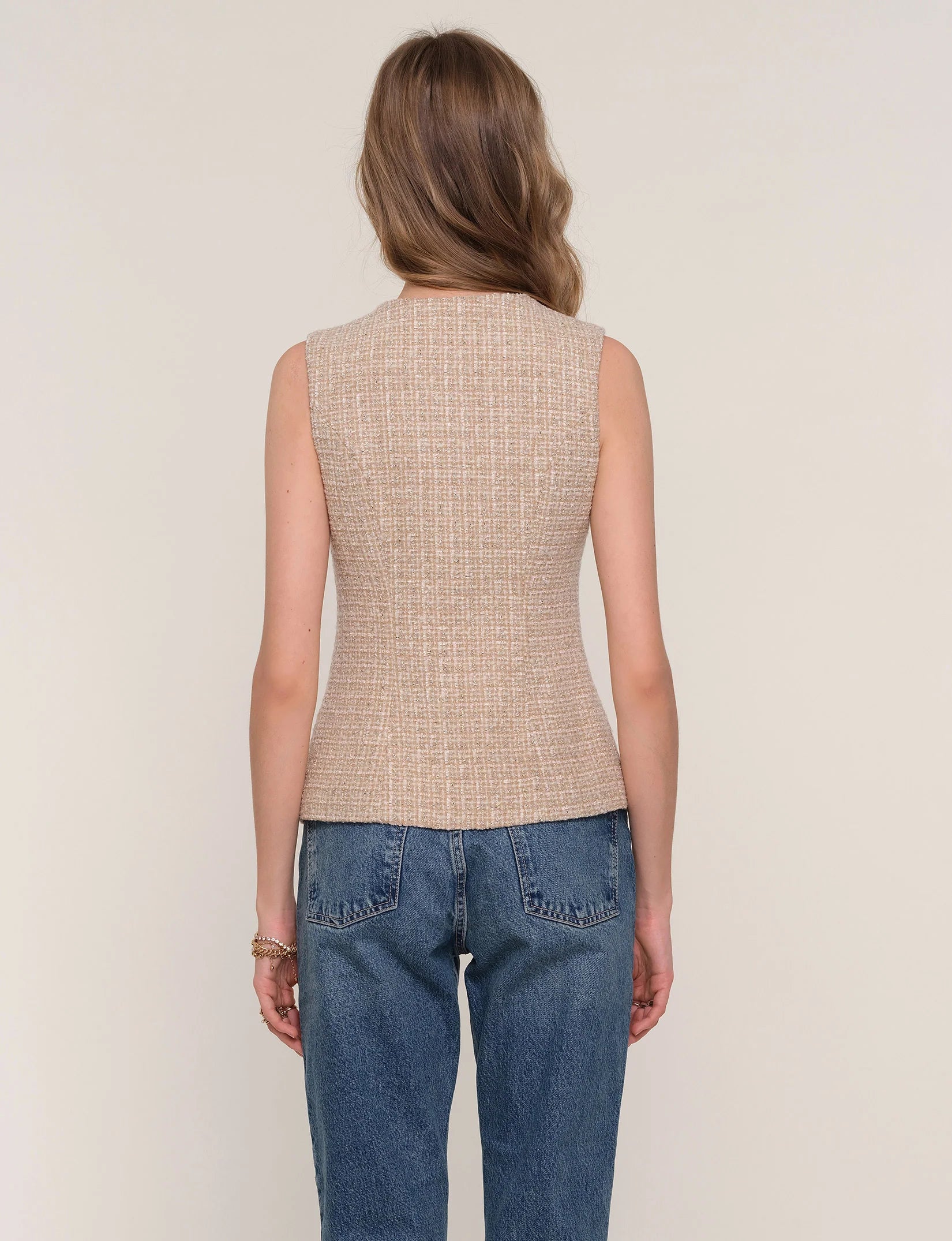 The Chase Vest has become a Heartloom favorite. Made from a tonal, textured tweed, it features a crew neck, pinched waist and novelty buttons. Pairs perfectly with your favorite denim.