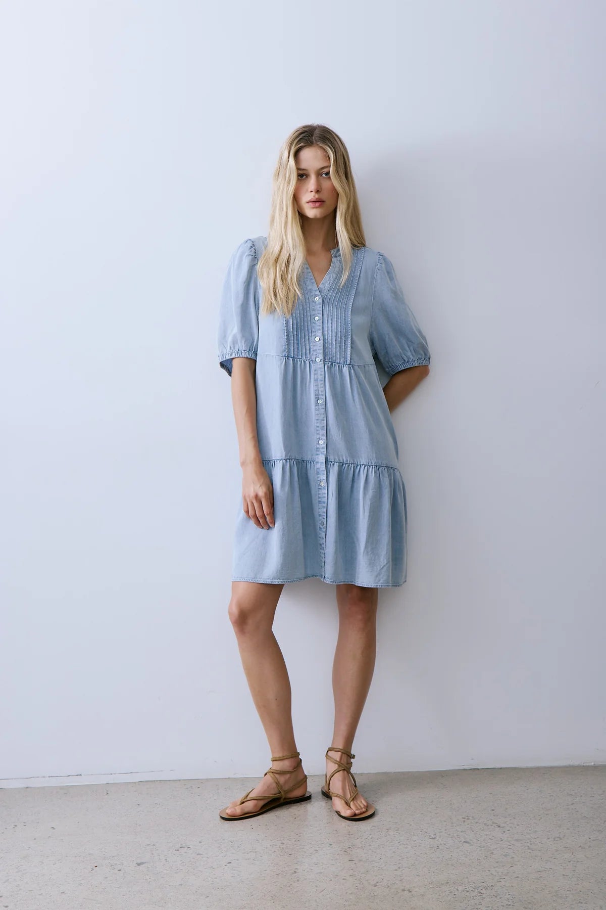 Split-neck dress featuring a multi-tiered skirt and decorative vertical stitched pleats across the chest. Designed with a full-length button-front closure and a relaxed fit, it presents a soft, feminine silhouette suitable for versatile styling.