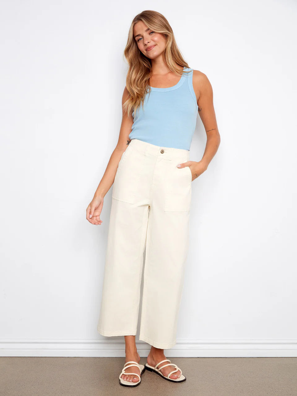 Transform your casual spring wardrobe with our Cropped Utility Pocket Twill Pants, expertly crafted in a stretchy fabric for unmatched comfort and flair. Their natural off-white color seamlessly complements any top, making these pants the ultimate choice for a laid-back day out.