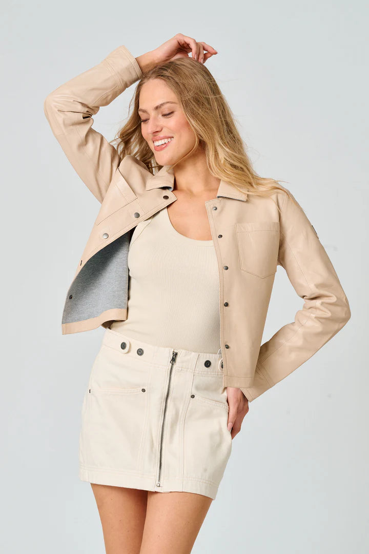 The Lefei Jacket blends style and comfort, making it the ultimate wardrobe staple. This cropped, collared shirt jacket is crafted with light leather bonded to a poly-cotton blend fabric, offering a unique and fashionable edge.