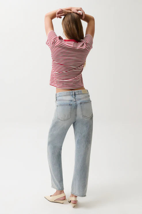The best-selling jean that understands proportions. Lexi sits at the perfect mid-rise with our signature bowed straight leg, a subtle curve at the knee that creates dimension without effort. Finished with a 29" inseam, the sculpted silhouette tapers to a cropped ankle with a clean hem. Crafted from our rigid denim in Bowie, a light wash with lived-in fading.