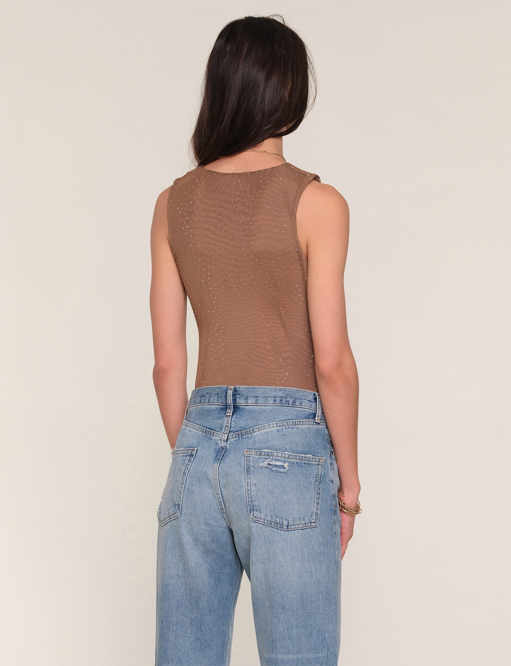 The Mariana Bodysuit is made from a stretch mesh with foil printed polka dots. It has a slim fit, a crew neck and is fully lined.