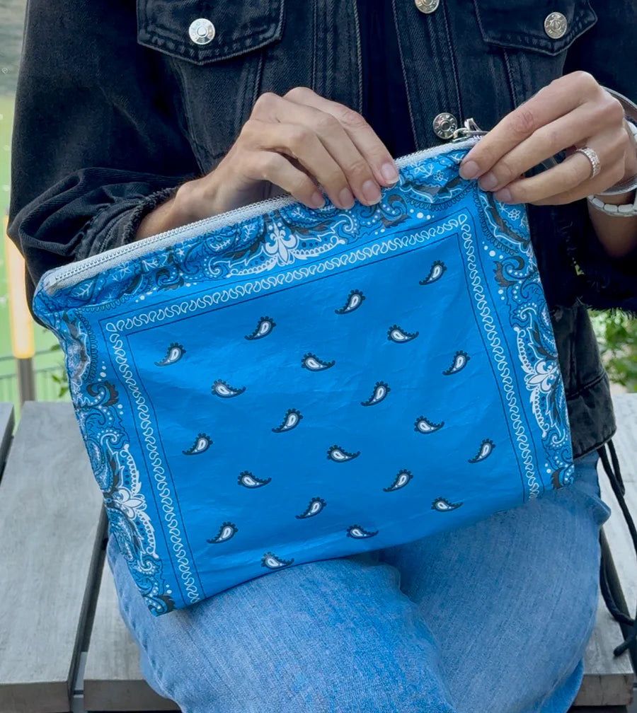 Channel your inner Emily in Paris with our stylish sky blue bandana pouch. This trendy accessory adds a pop of color and western charm to your daily routine, perfect for anyone looking to make a statement with versatility.