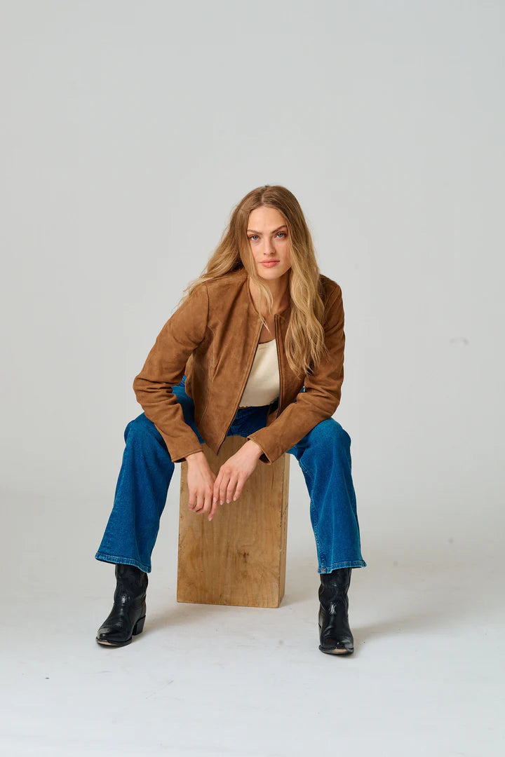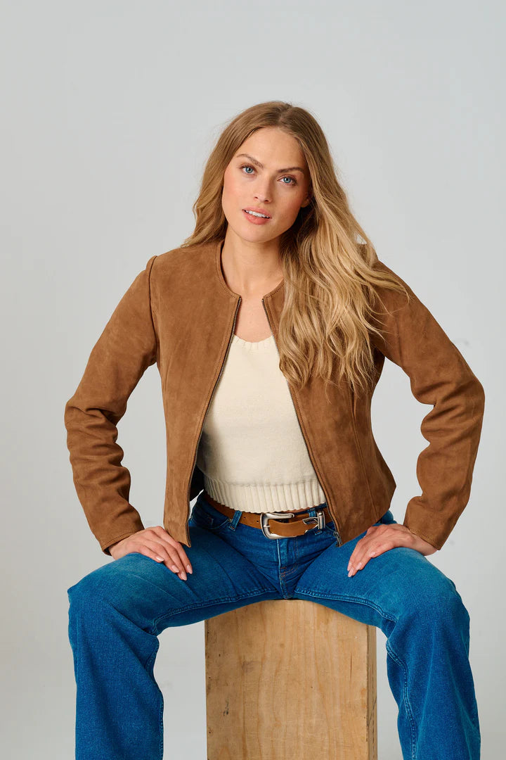 Quynn is your go-to layer for effortless style. Crafted from nubuck leather, this fitted jacket pairs seamlessly with everything from jeans to dresses. Its relaxed yet polished silhouette works equally well for casual outings or dressed-up occasions.
