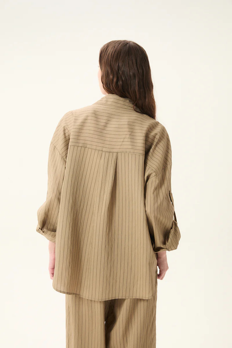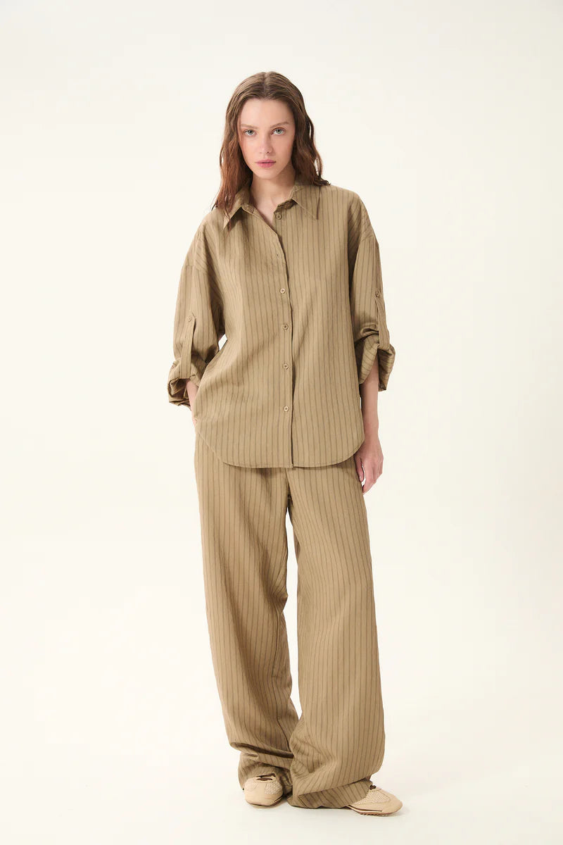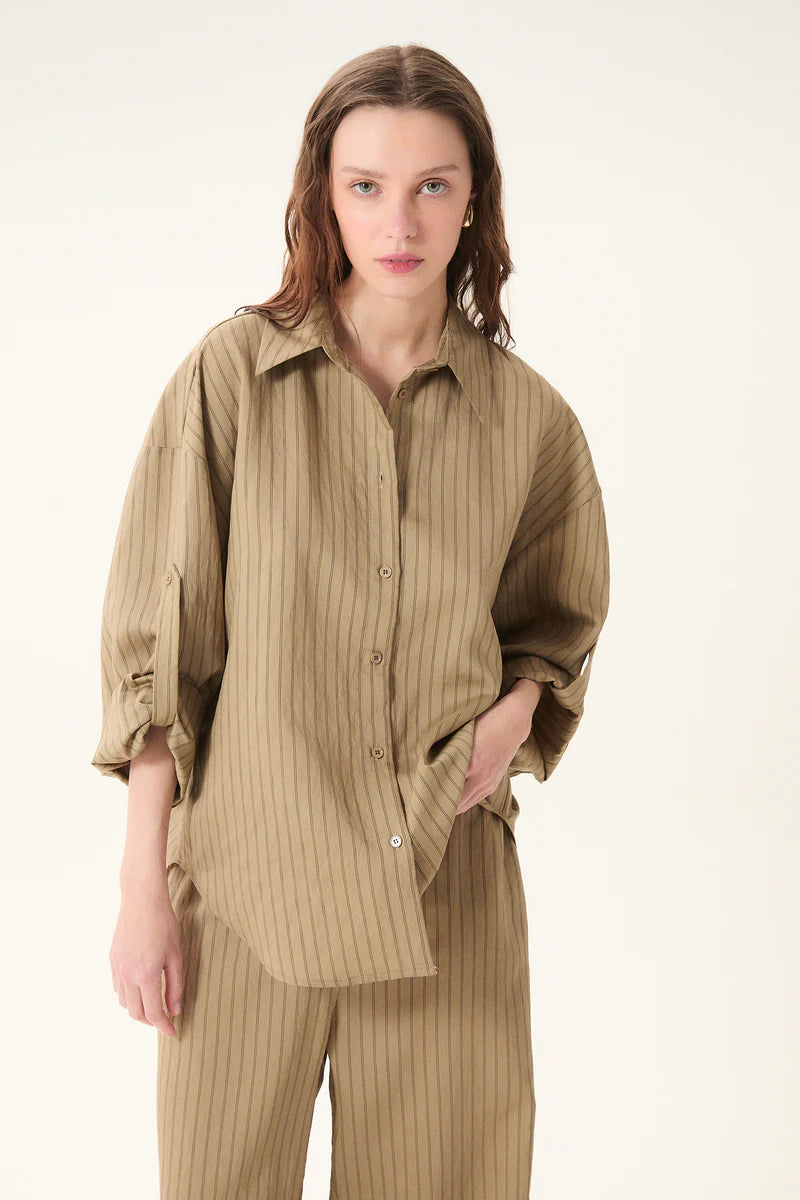 Pajama-inspired striped shirt with a standard collar and long sleeves finished with buttoned cuffs. Designed with a front button closure, a back yoke, and a box pleat for ease and movement. Features a button and internal sleeve tab for rolling up the sleeves. Finished with a rounded hem and a relaxed fit for an effortless, laid-back look.