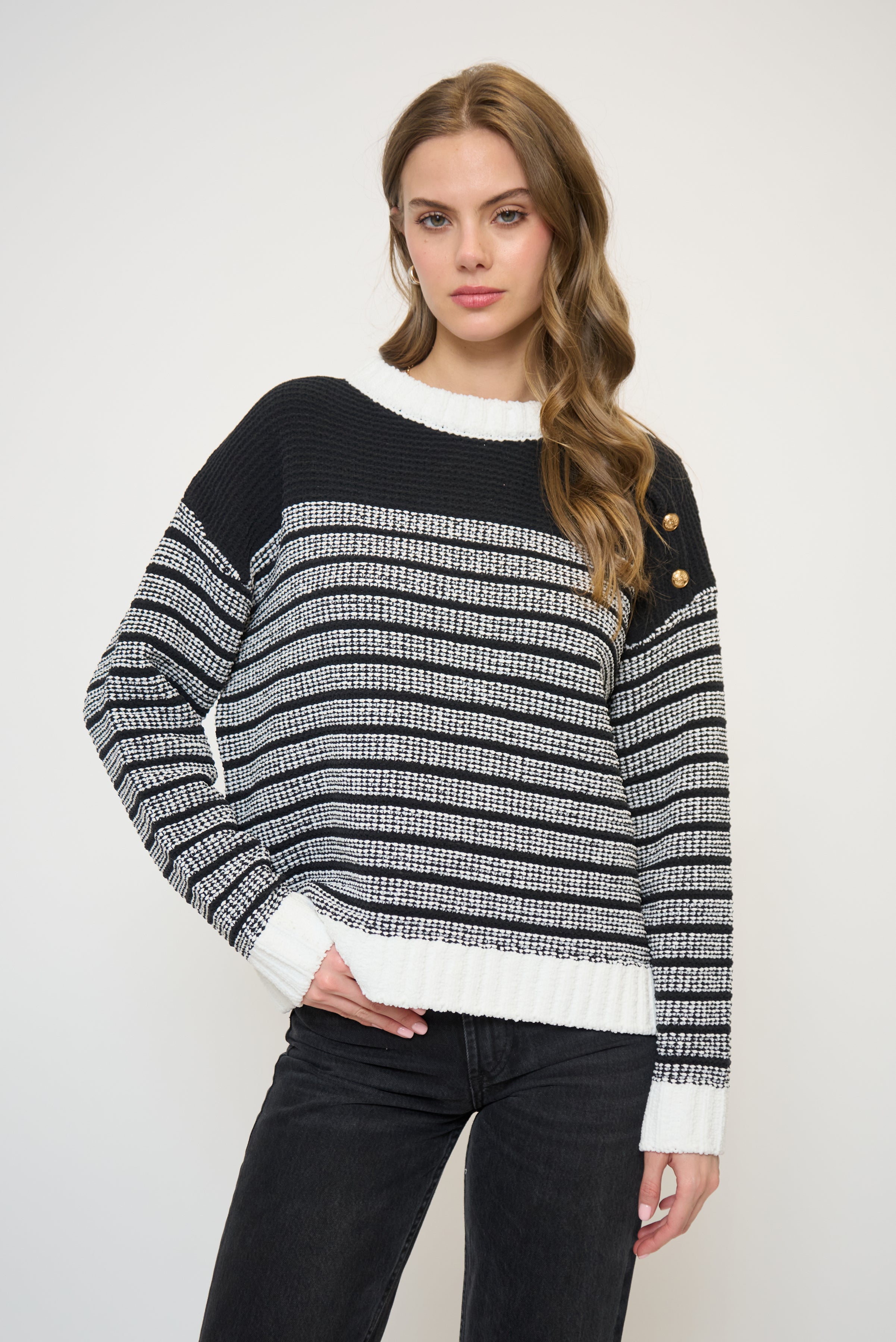 Crew neck striped sweater with shoulder buttons