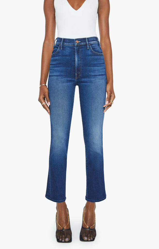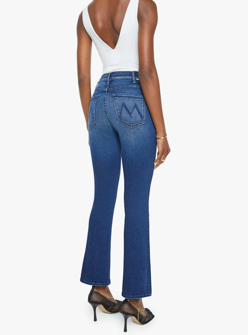 Roll the dice. This bestselling high-rise flare has an ankle-length inseam and a clean hem. Made from stretch denim, Taking Chances is a dark blue wash with whiskering and fading at the knees.