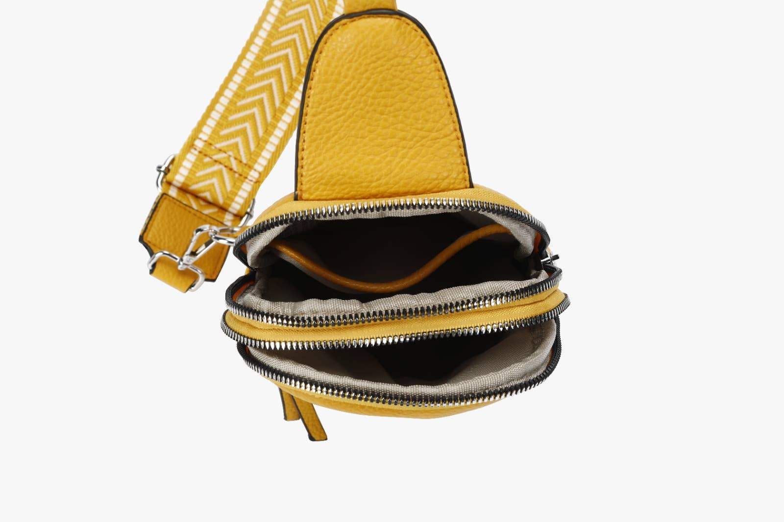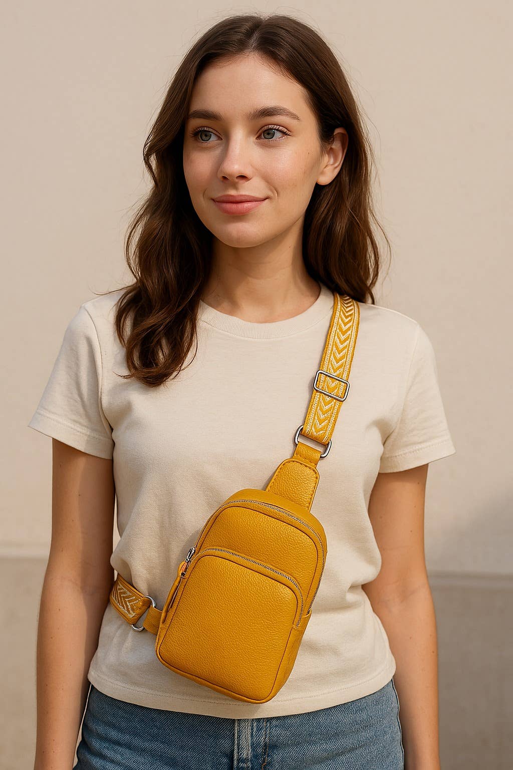 Add a pop of flair to your look with this faux leather fanny pack, both trendy and functional. Designed to fit your daily life, it can be easily worn crossbody or at the waist thanks to its adjustable strap with a white and yellow chevron pattern, for a bold and original style. Made from quality faux leather, with a soft and durable feel, it offers great durability while remaining lightweight. Its main zipped compartment and front pocket allow you to keep your essentials within reach, safely. Features: Material: Grained faux leather Adjustable strap with chevron pattern Sturdy zip closure Ideal dimensions for phone, wallet, keys, etc. Urban look, perfect for outings, travel, or festivals Perfect for those who love to combine style and practicality every day!