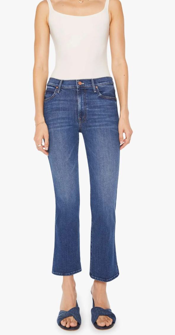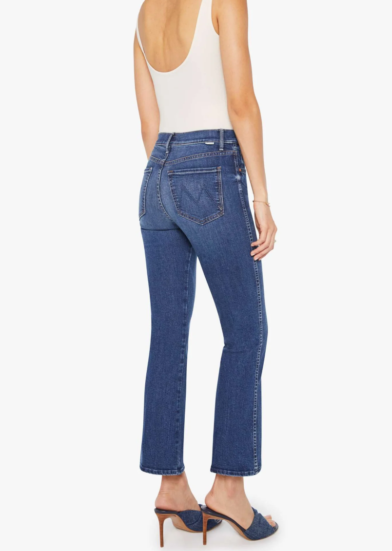 Ready, set, go. Mid-rise jeans with a flared leg, zip fly and a 29.75-inch inseam with a clean hem. Made from a blend of recycled stretch denim, Start Your Engines is a dark blue with whiskering and fading at the knees.