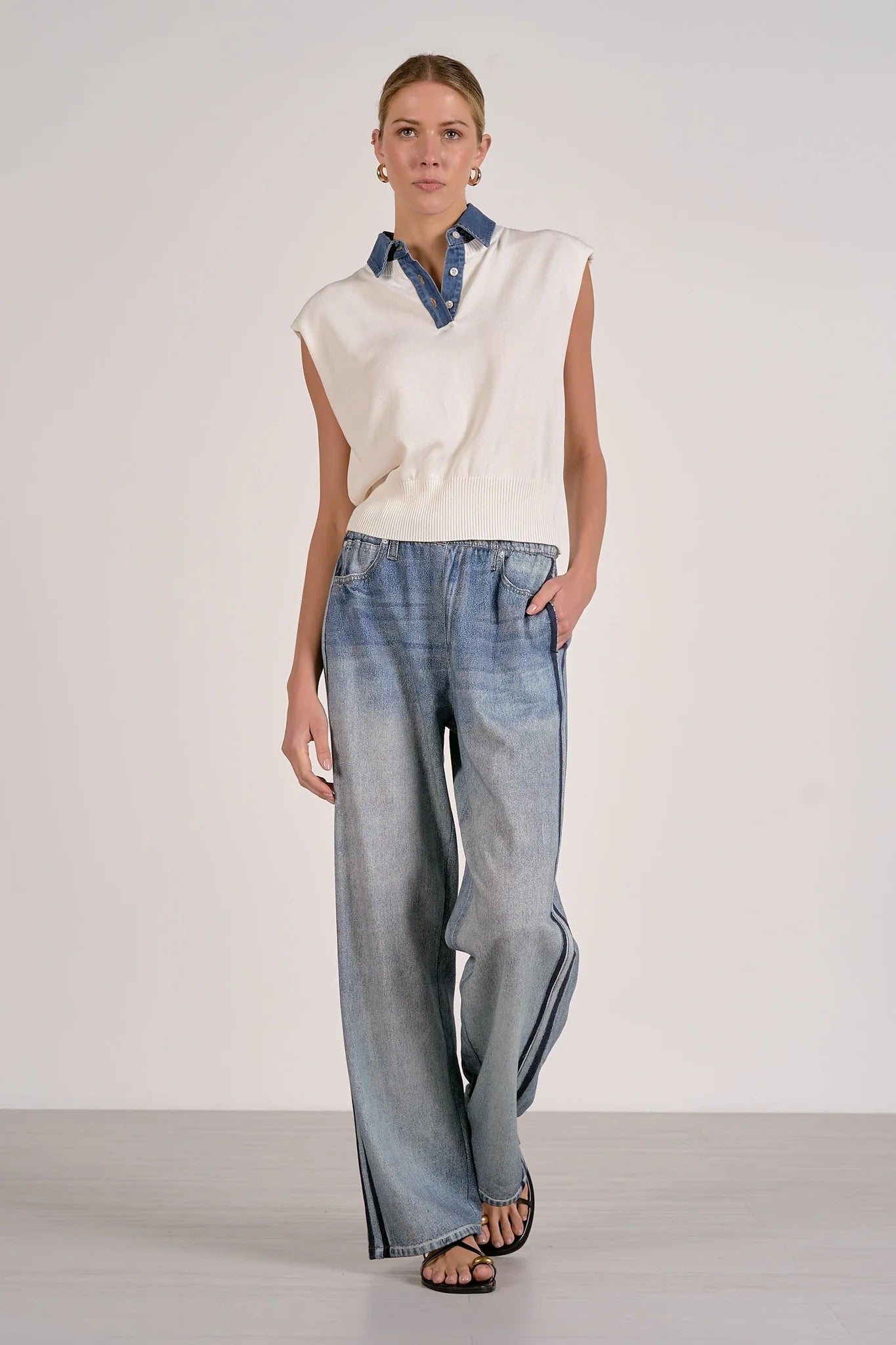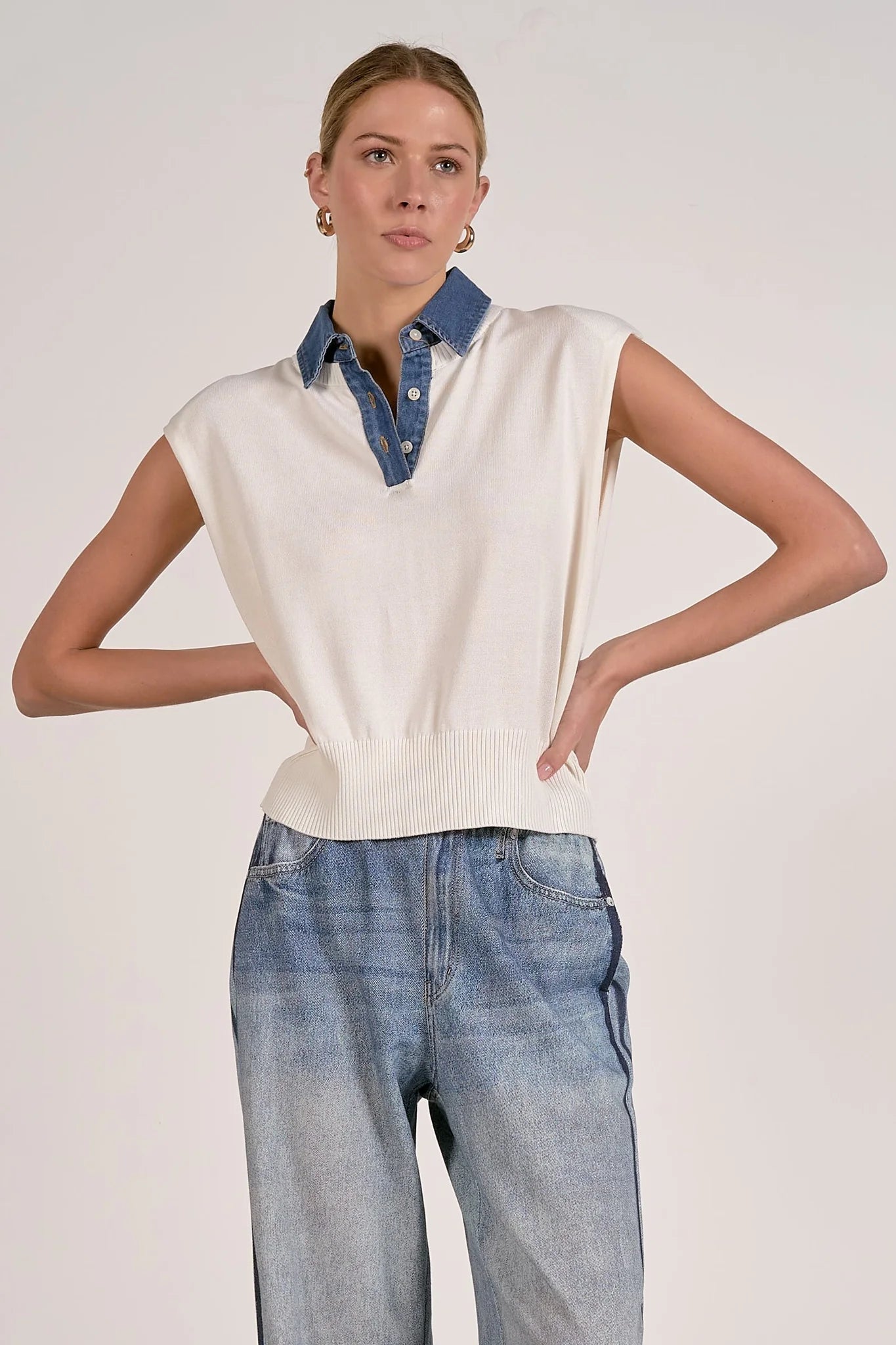Polished meets playful in the Piper sweater — a modern take on the cap sleeve silhouette. Crafted in a soft knit with a structured mock neck and denim trim detailing, this mixed-media top adds dimension to any spring rotation. A perfect pairing for high-rise denim or relaxed tailoring, it offers a subtle statement with effortless appeal.