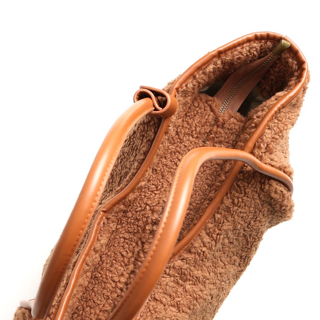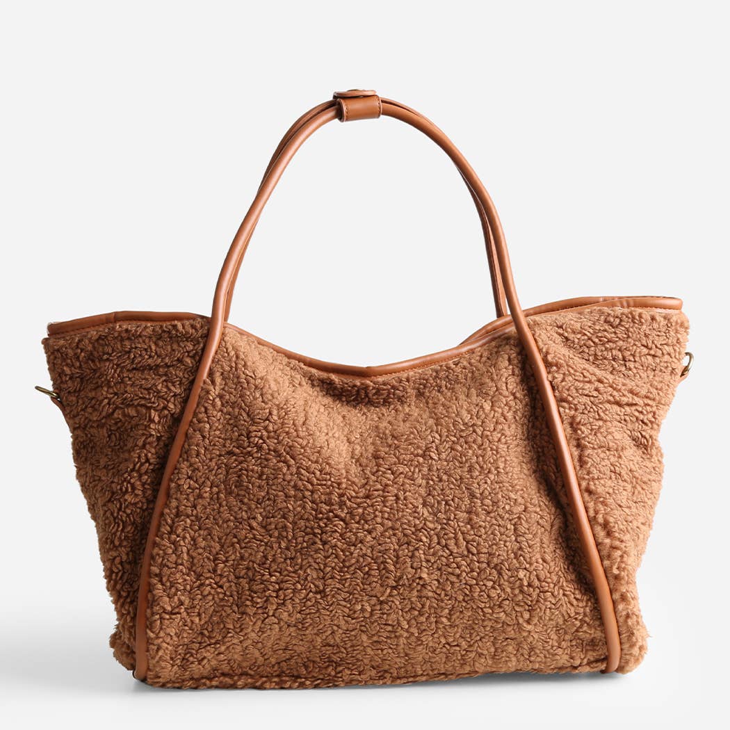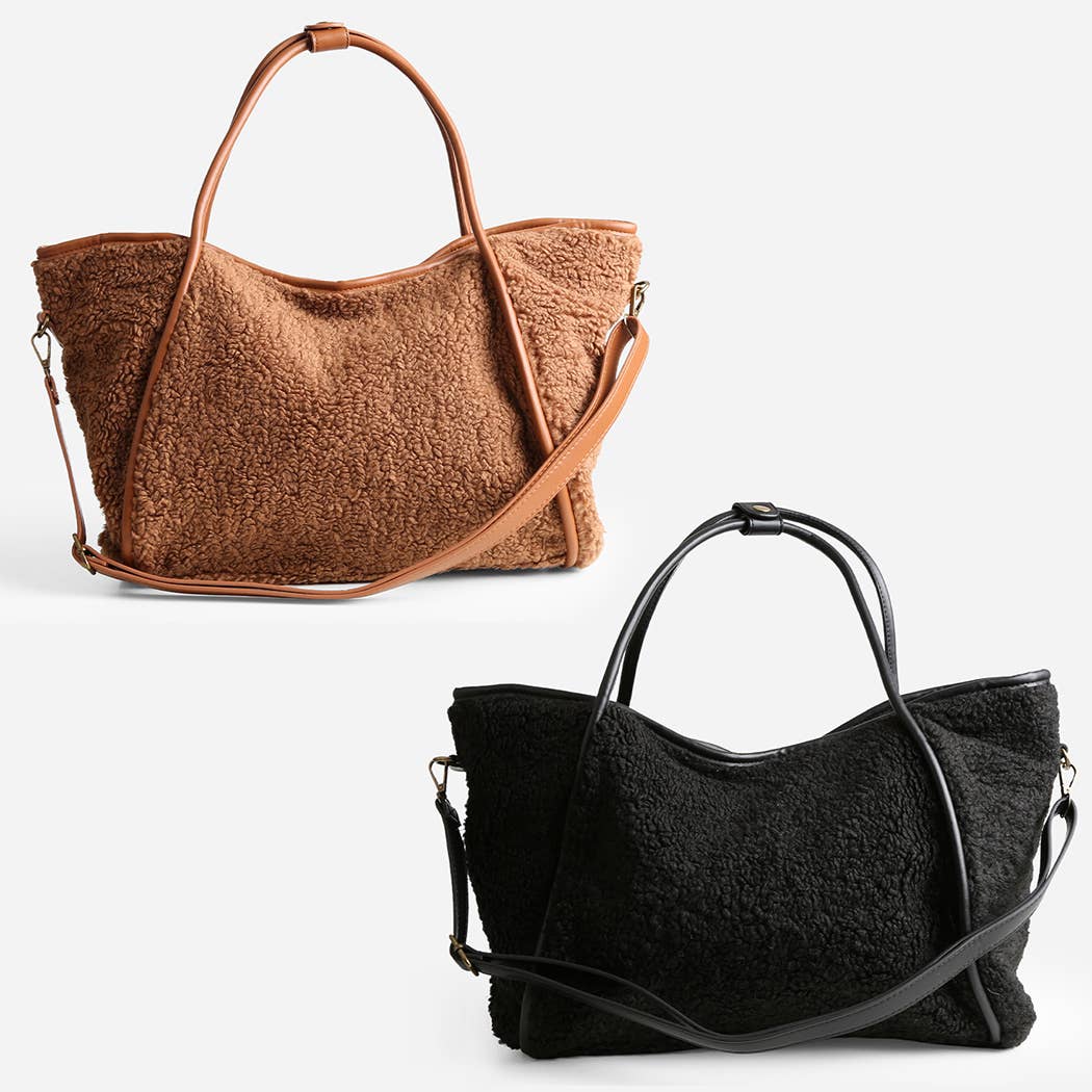 Stay stylish and cozy with this faux shearling shoulder tote bag, available in classic Camel and Black. Designed with a plush, textured exterior and smooth faux leather trim, this bag blends comfort and elegance effortlessly. Dual top handles and a detachable crossbody strap offer versatile carrying options, while the spacious interior makes it perfect for daily essentials.