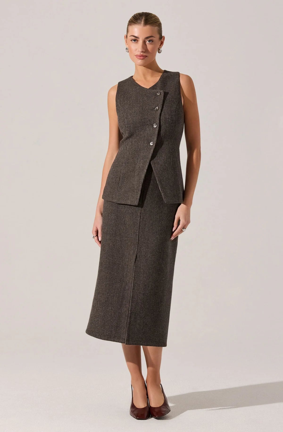 Designed with a structured silhouette and tonal buttons down the front, this vest channels vintage menswear with a modern twist. Whether worn solo or with its matching skirt, this vest is perfect for the office or running errands on the weekend.