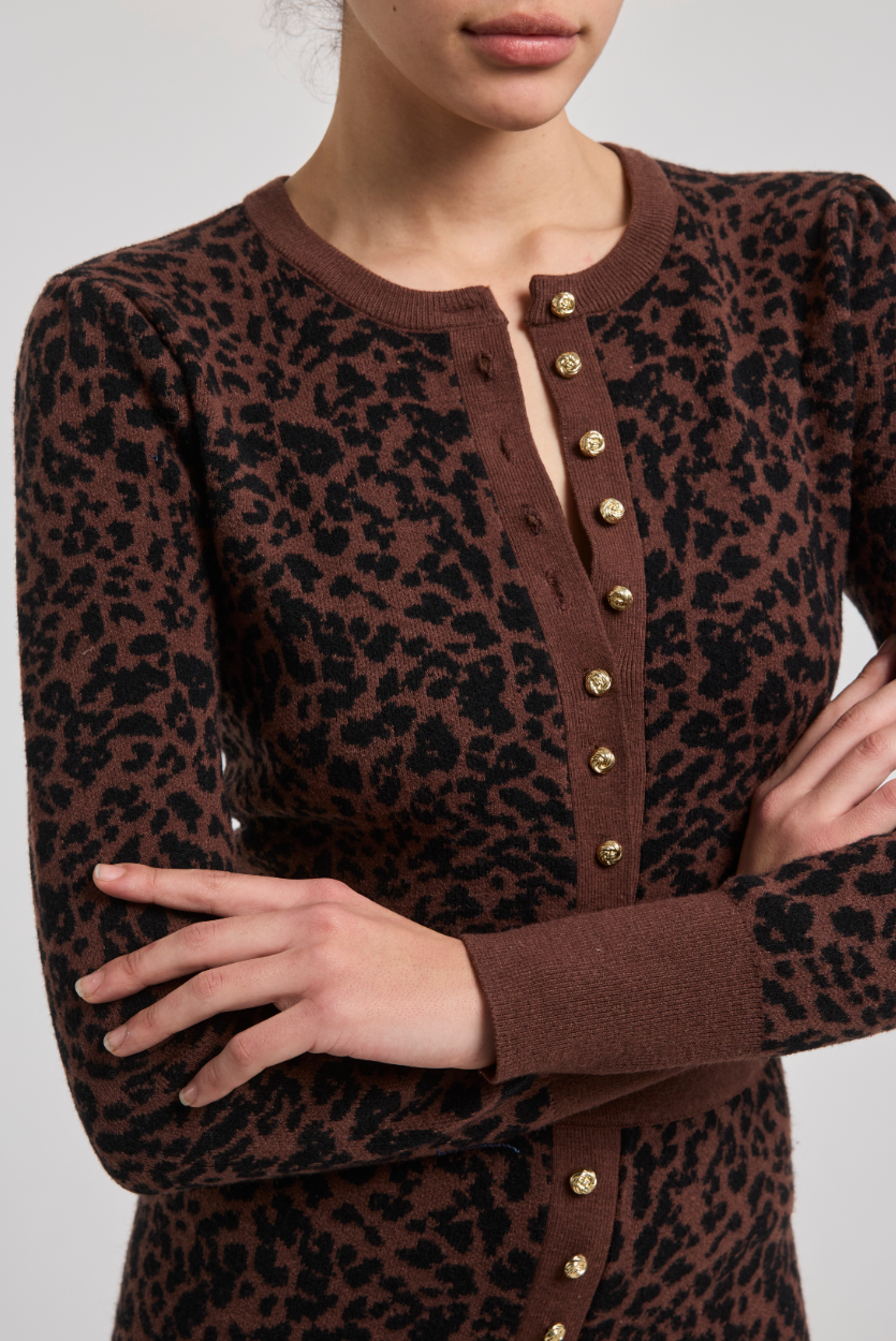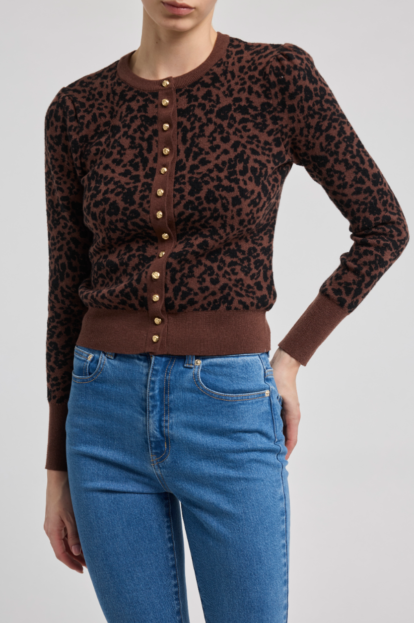 Cardigan. Featuring a rich brown and black leopard jacquard knit, this crewneck button-down is accented with gold hardware and ribbed trim for a polished finish. Slightly cropped for a flattering, modern silhouette, it pairs effortlessly with denim, trousers, or the matching skirt. Wear it solo or layered — it’s a standout piece either way.