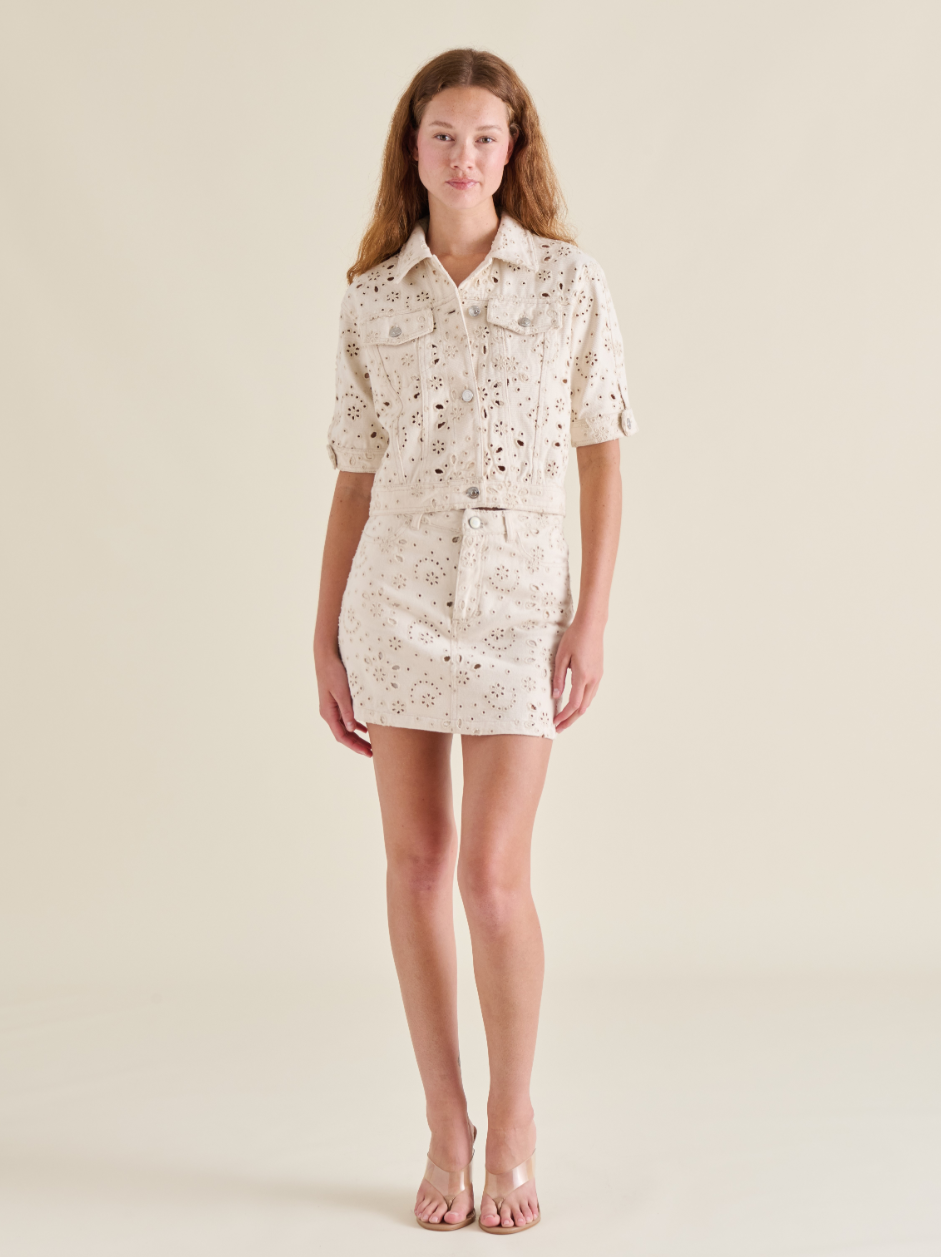 The Blu Jacket in SEA MIST combines timeless denim craftsmanship with contemporary design details. This long-sleeved button-up style features a refined eyelet design throughout, adding visual interest and texture to the classic silhouette.