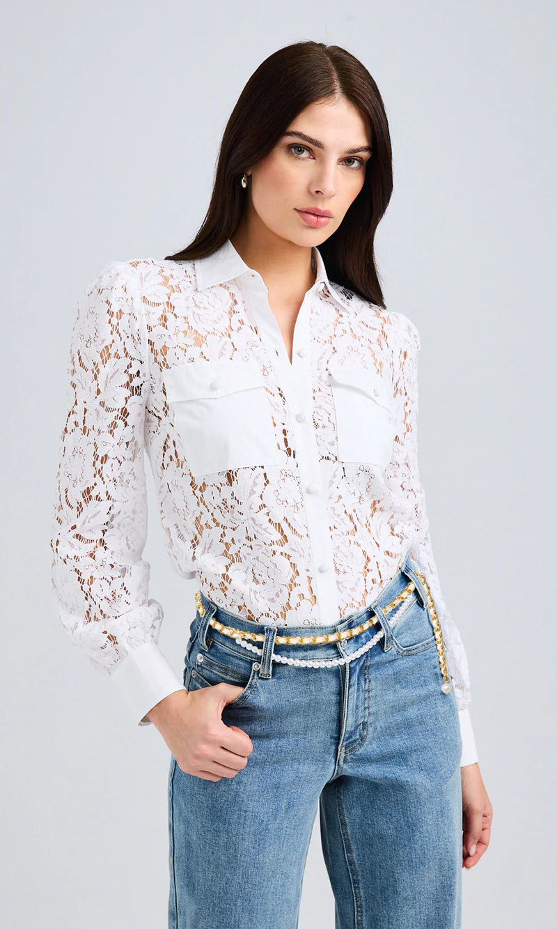 A modern take on the classic button-down, this chic shirt showcases white floral lace with a delicate eyelash finish at the hem. Pair it with a tweed skirt for the perfect balance of timeless elegance and contemporary style.