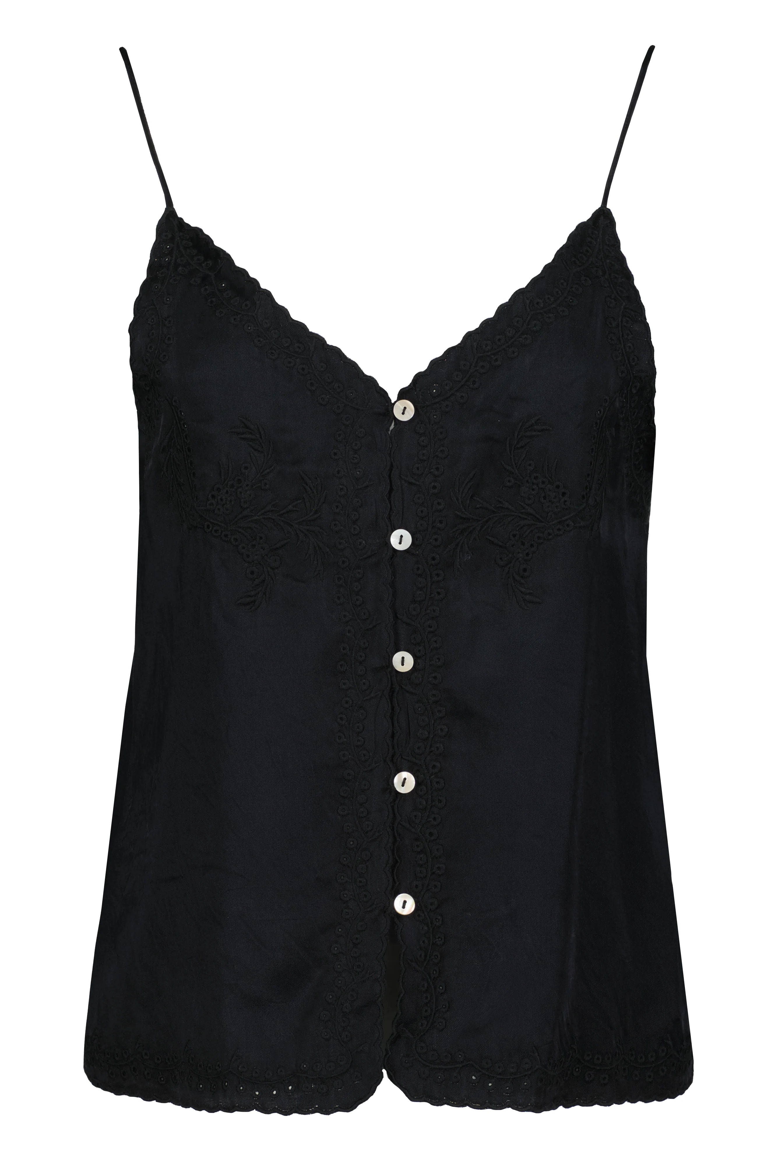 The Anya Button Front Embroidered Cami offers a softly structured black silhouette detailed with delicate embroidery and scalloped trim, finished with tonal buttons for a hint of vintage romance.