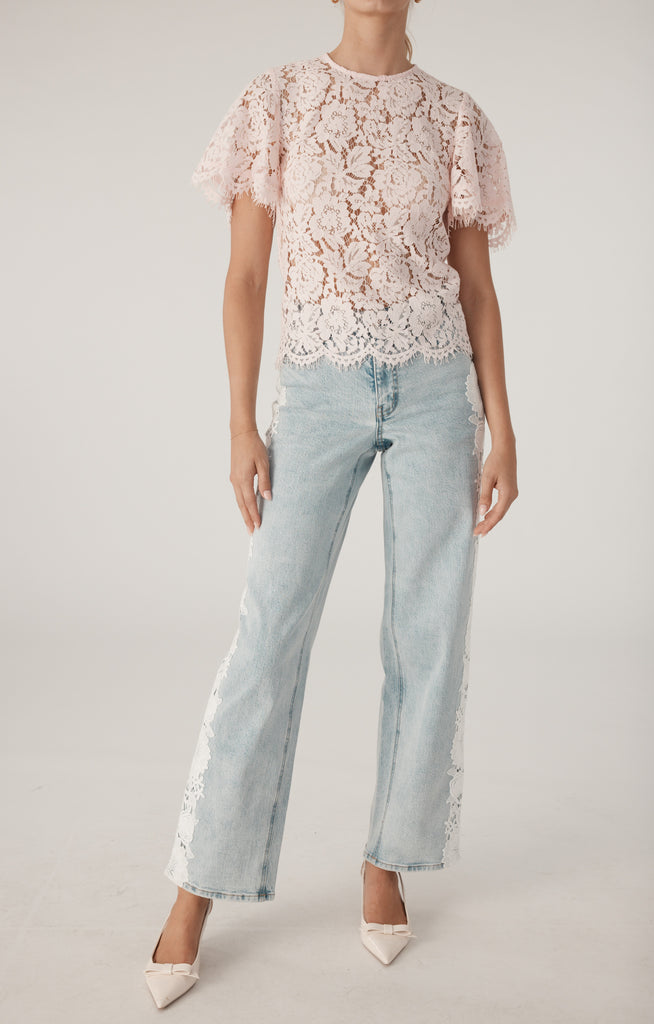 Semi-sheer white floral lace meets crew neck t-shirt styling in this charming top. Scalloped eyelash lace at the sleeves and hem adds a touch of romance. Pair it with jeans for a chic look or with skirts for a contemporary vibe.