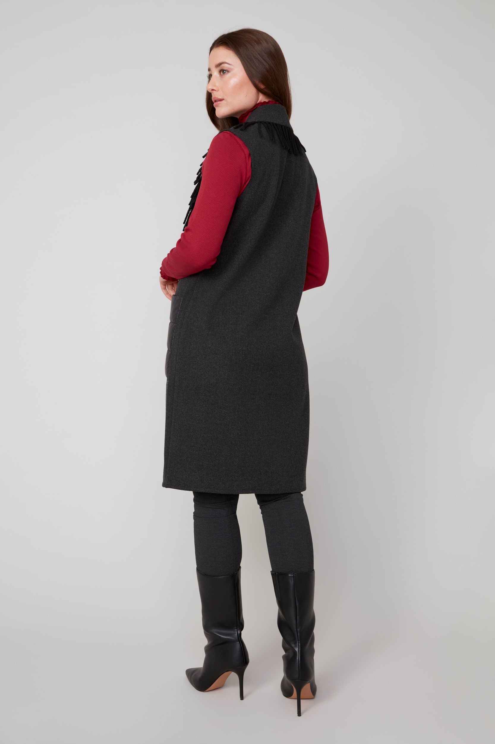 Long vest with quilted detail and fringe
