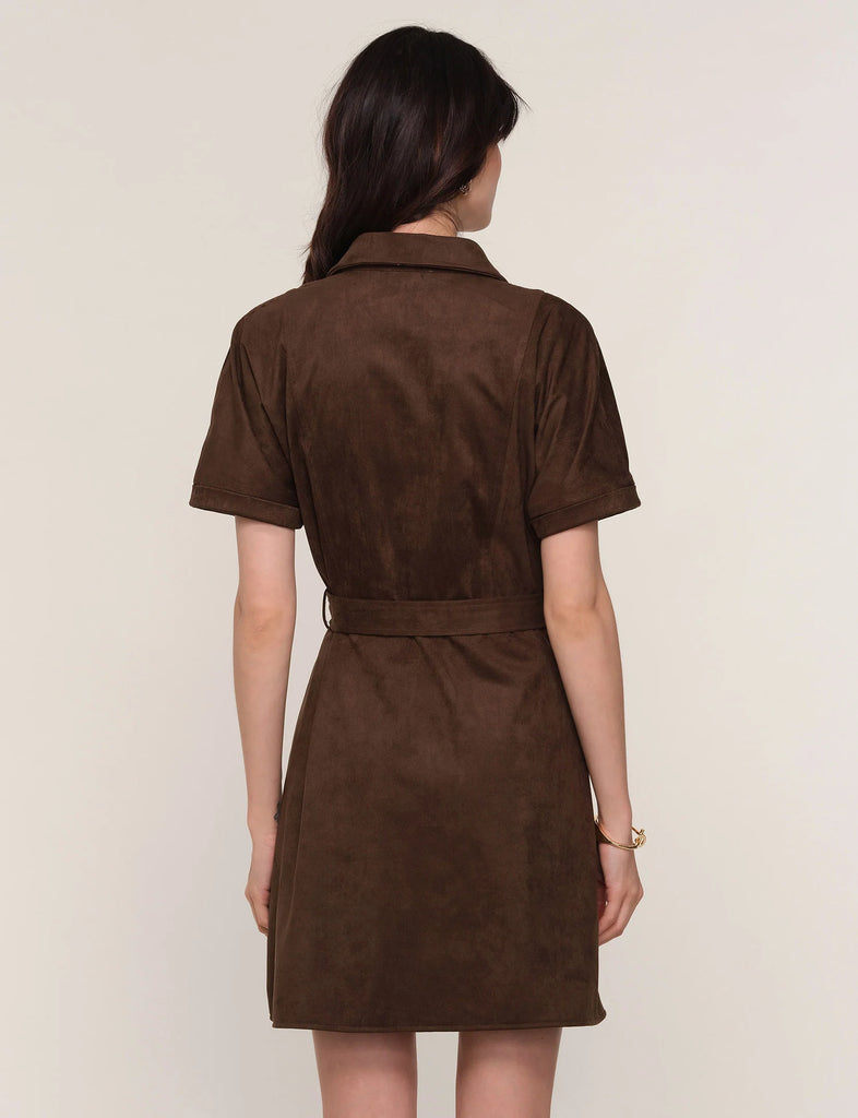 Crafted from soft suede, the Margot Dress is a classic shirt dress. It features a slim, flattering fit and a self belt.