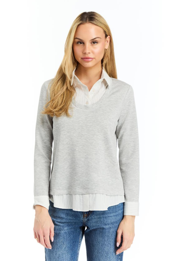 Striped collar shirt layered over a scoop neck sweater