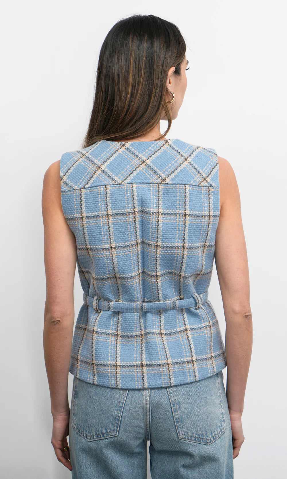 Crafted from a chic, textured plaid fabric in serene blue hues complemented by warm brown and cream accents, this vest offers a refined statement. It features a classic round neckline and a full button-front closure adorned with exquisite ornate, gold-toned buttons that add a touch of vintage charm.